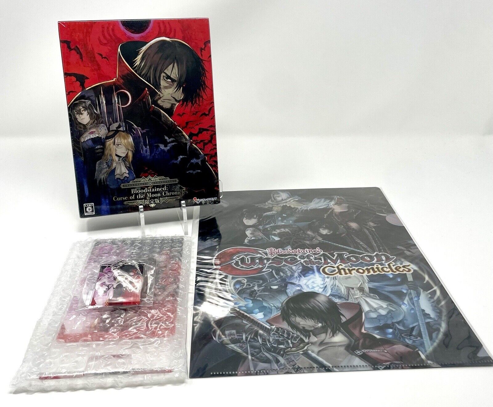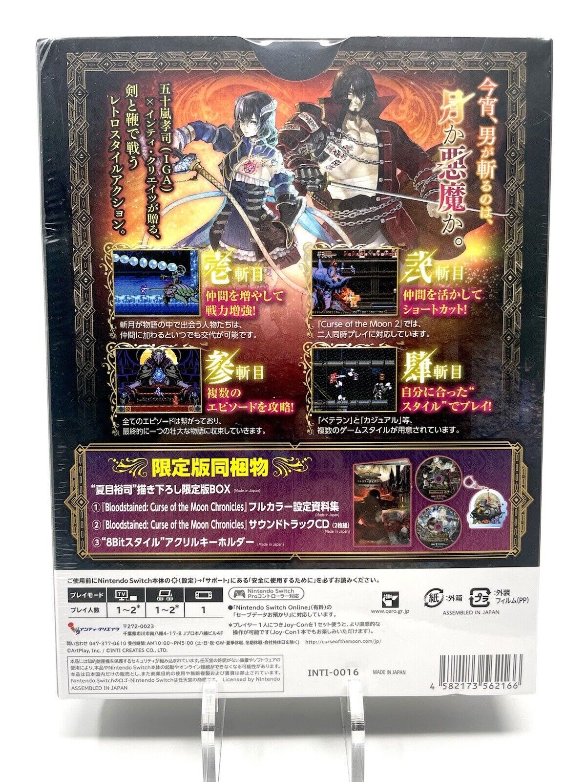 Item is brand new in original shrink wrap. The collector's edition includes a keychain, artbook, and game cartridge containing both Bloodstained games. This set also includes the first press bonus clear file and retailer-exclusive bonuses (acrylic keychain and acrylic stand). Game plays in English.